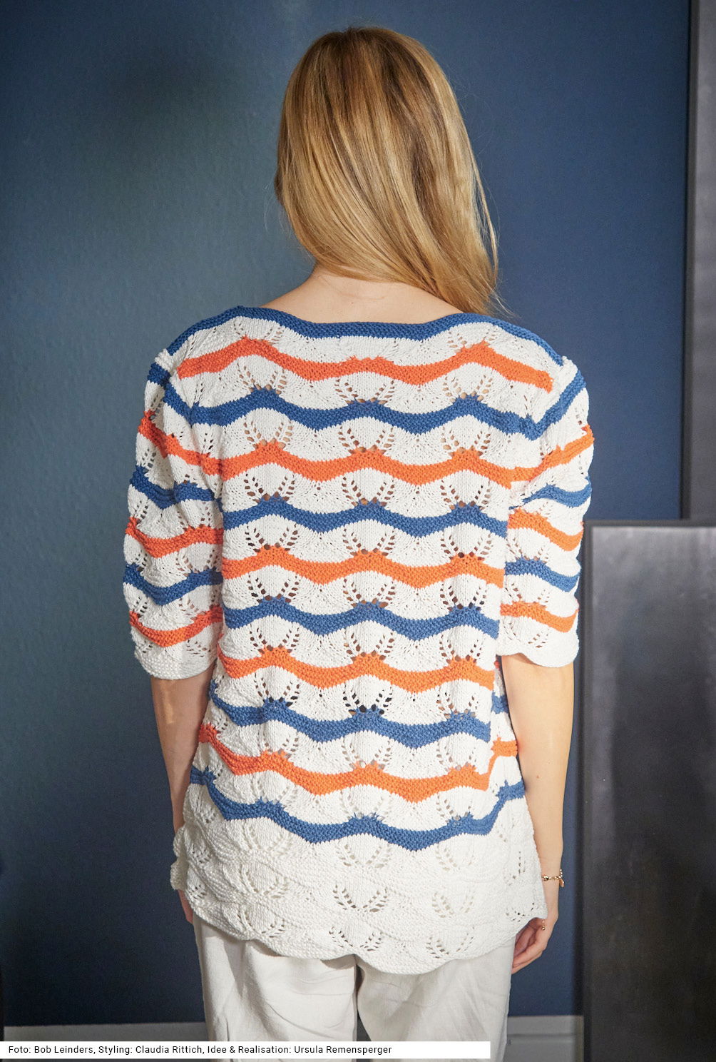 Für diese bis über die Hüften reichende Tunika wird ein Ajourmuster gestrickt, das ganz von selbst leicht wellige Linien ergibt. Die ellbogenlangen Ärmel enden breit, sodass die Schulterpartie zusätzlich zum geraden U-Bootausschnitts betont wird. Das luftige Ajourmuster fängt ganz in Weiß an und bekommt eine Akzentuierung durch die schmalen kraus rechts gestrickten Streifen in Jeansblau und Rot. Das kühle Garn aus einer Mischung von Baumwolle und Leinen ist auch für warme Sommertage geeignet. Die Anleitung steht für die Größen 38/40 und 46/48 zur Verfügung.
