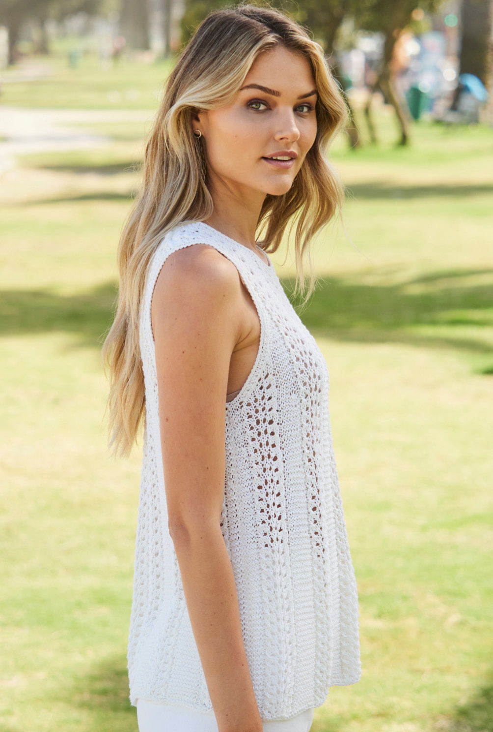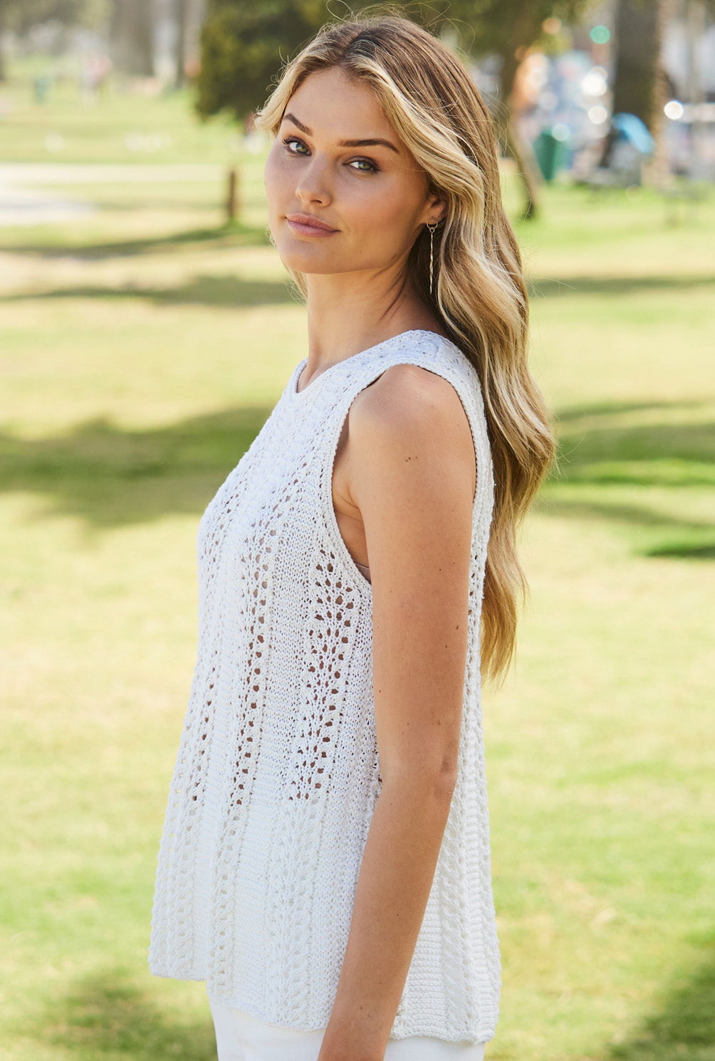 Das weiße Top mit Lochmuster mit Krausrippen dazwischen ist ein echtes Multitalent, das tagsüber lässig-cool zur Jeans oder am Abend elegant zum weit schwingenden Rock tragbar ist. Im Urlaubskoffer nimmt es nur wenig Platz weg. Der runde Halsausschnitt wird mit einer schmalen, glatt rechts gestrickte Blende eingefasst; ebenso auch die Armausschnitte. Das Mischgarn aus Baumwolle und Seide ist das perfekte Sommergarn, denn beide Materialien sind eher kühl. Eine Anleitung steht zum Download bereit in den Größen 38/40, 42/44 und 46/48.