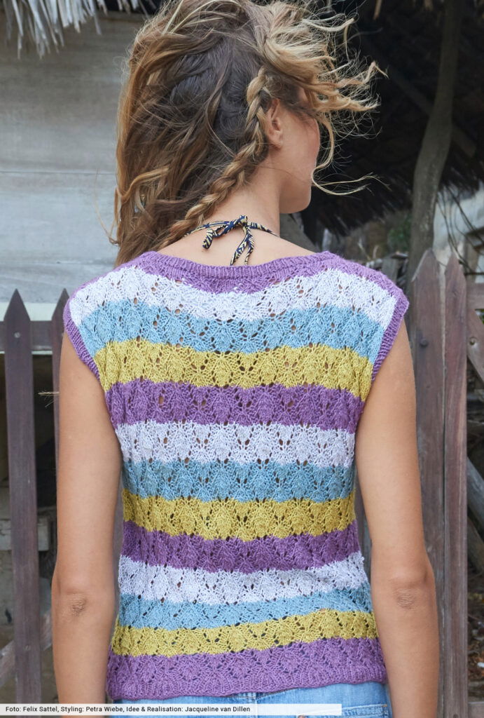 Einfach drüberziehen und sich auch an heißen Tagen wohlfühlen – so heißt das Motto bei diesem Top, das streifenweise allover in einem luftigen Ajourmuster gestrickt wird. Dafür findest du direkt bei unserer Anleitung eine übersichtliche Strickschrift, die dir die Arbeit erleichtern wird. Schmale Rippenbündchen am Saum, an den Ärmelrändern und dem Halsausschnitt bilden den klassischen Rahmen.