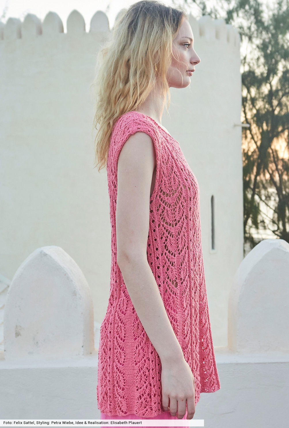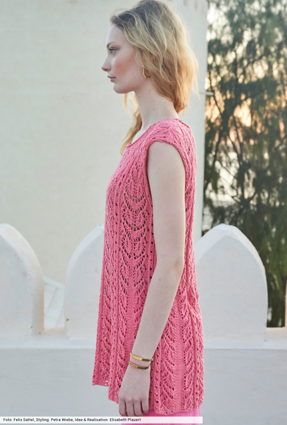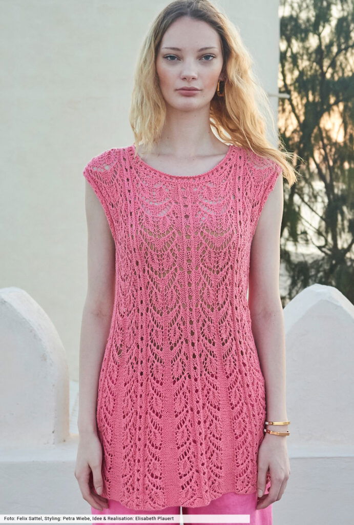 Die schmeichelnde A-Form dieses Tops entsteht durch Maschen, die innerhalb der Glatt-links-Flächen zusammengestrickt werden. Dies ist in unserer Anleitung genau beschrieben und auch für die Ajourmuster-Streifen gibt es eine übersichtliche Strickschrift. Das sommerliche Garn besteht aus Baumwolle, die mit Fasern aus Viskose und Leinen angereichert wurde – eine tolle Kombination, die weichen Tragekomfort garantiert.
