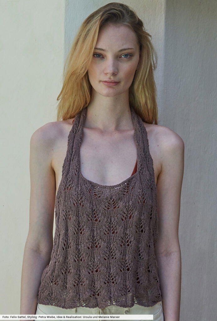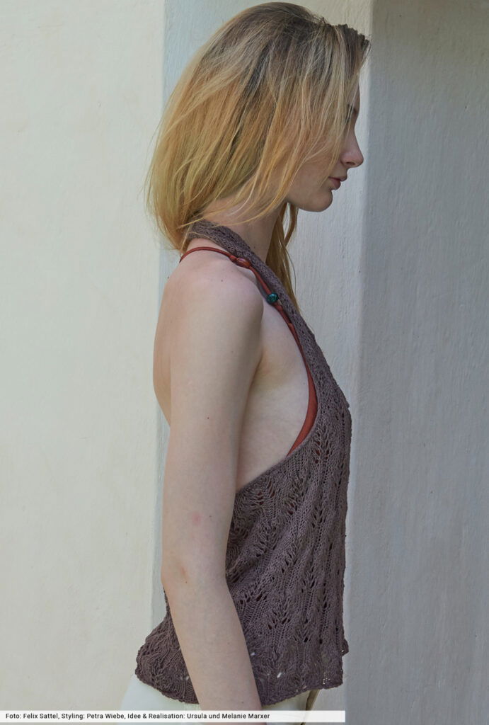 Material: LANA GROSSA "Linissimo" (50% Baumwolle, 50% Leinen, LL = 187 m/50 g) 150 (150) 200 g Graubraun (Fb 07). 1 Rundstricknadel Nr 3.