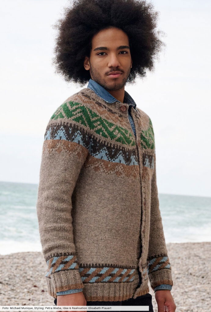 Ganz klassisch, aber durch die Farbgebung modisch interpretiert – so zeigt sich diese tolle Jacke, die jedes Freiluft-Abenteuer mitmacht. Wir haben sie bis zu den Armausschnitten an einem Stück gestrickt, dadurch ersparen wir uns das Konfektionieren der Seitennähte. Danach geht es für die Jacquardpasse in Norwegertechnik mit vier verschiedenen Mustern auch in einem Stück weiter, für die du übersichtliche Zählmuster direkt bei der Anleitung findest.