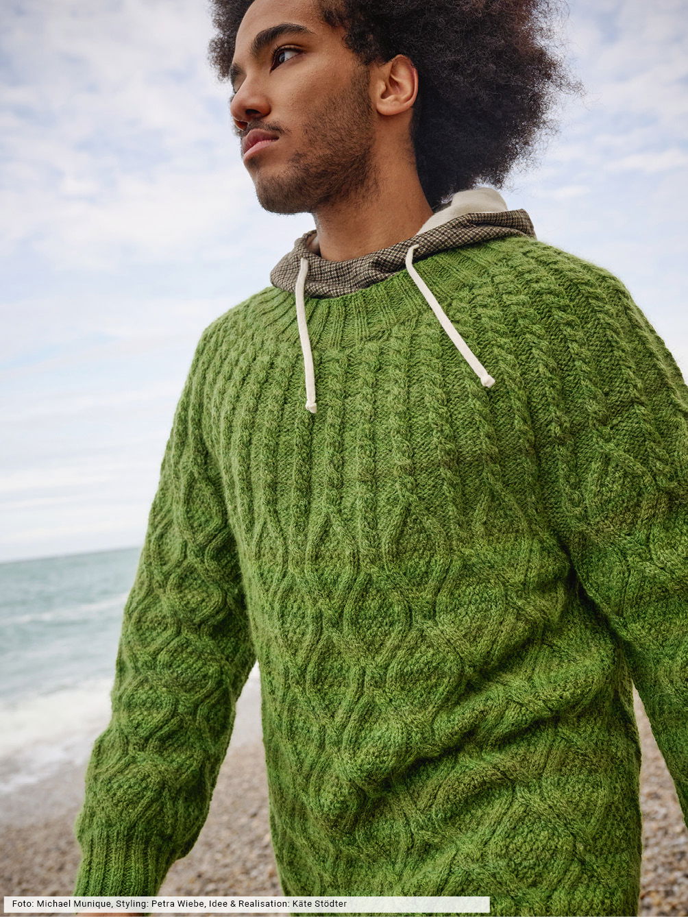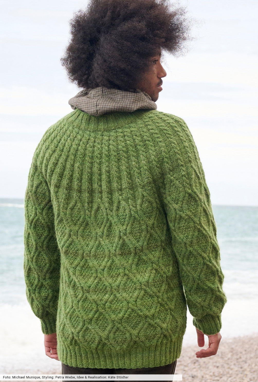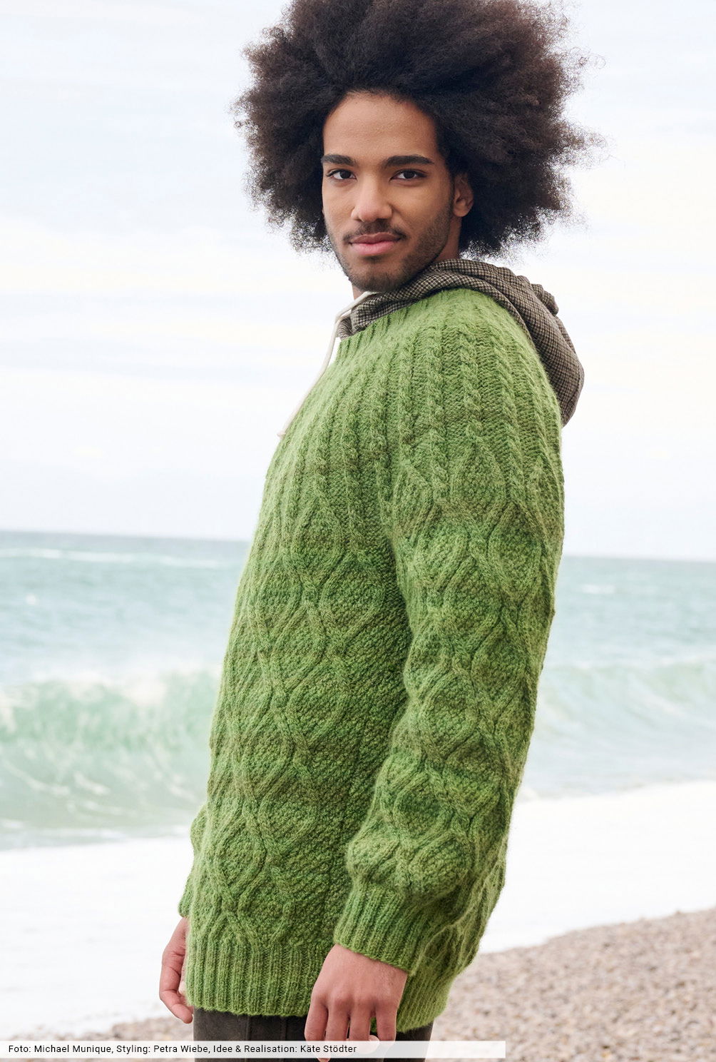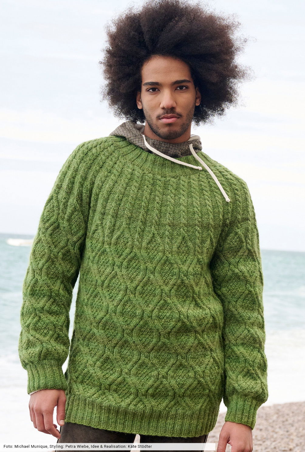 Ein weiches Schurwoll-Alpakagarn bildet die Basis für den moosgrünen Pulli, der besonders durch die plastischen Rautenstrukturen im unteren Teil Aufmerksamkeit erregt. Für die Rundpasse werden dann alle Maschen auf eine Rundstrick-Nadel genommen und du setzt die Arbeit im Zopfmuster fort. Dafür haben wir eine Strickschrift angelegt, in der auch die Abnahmen zu finden sind. Zum Schluss nur noch die gerippte Halsblende stricken und die Kanten zusammenähen – fertig ist ein Stück fürs Leben!
