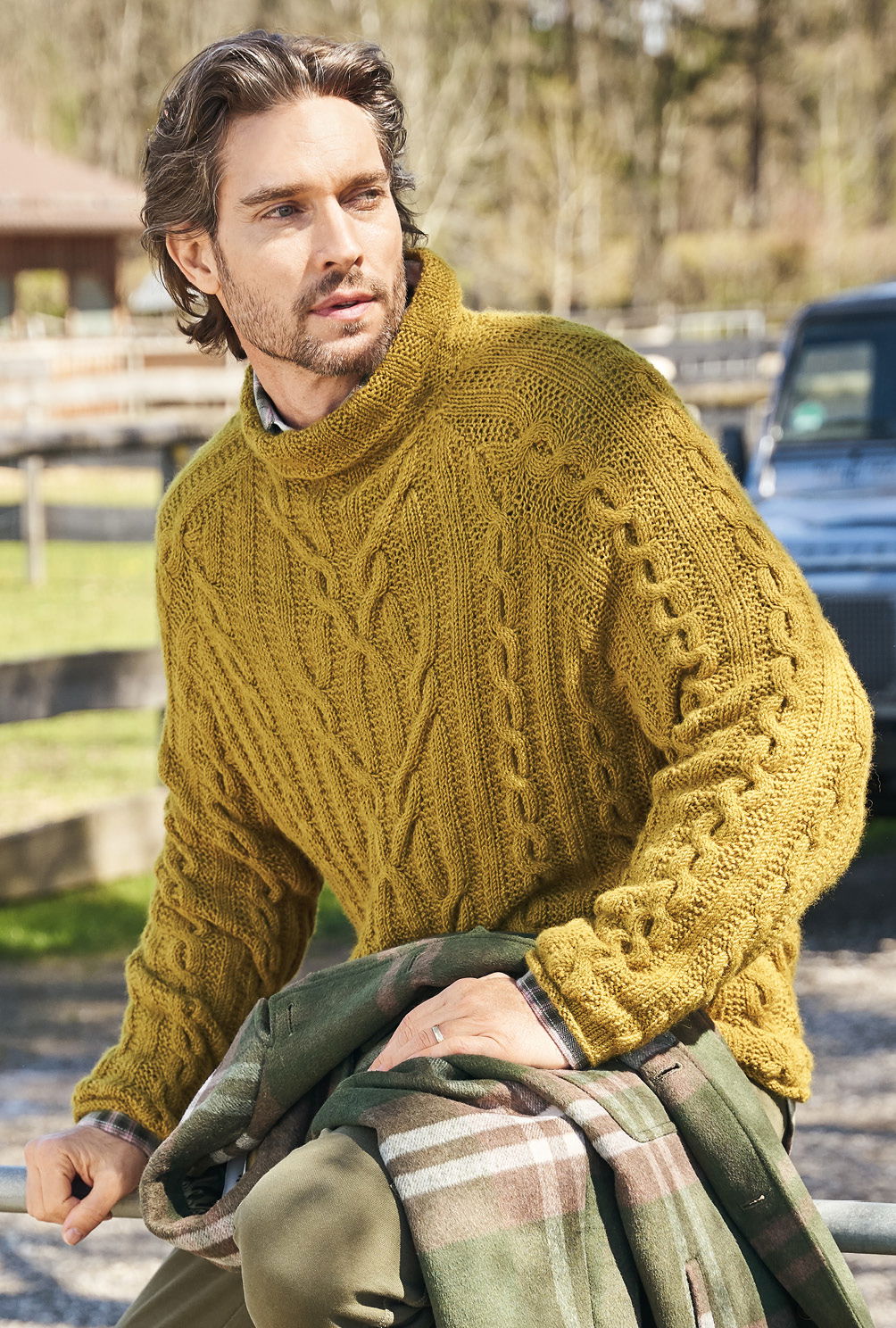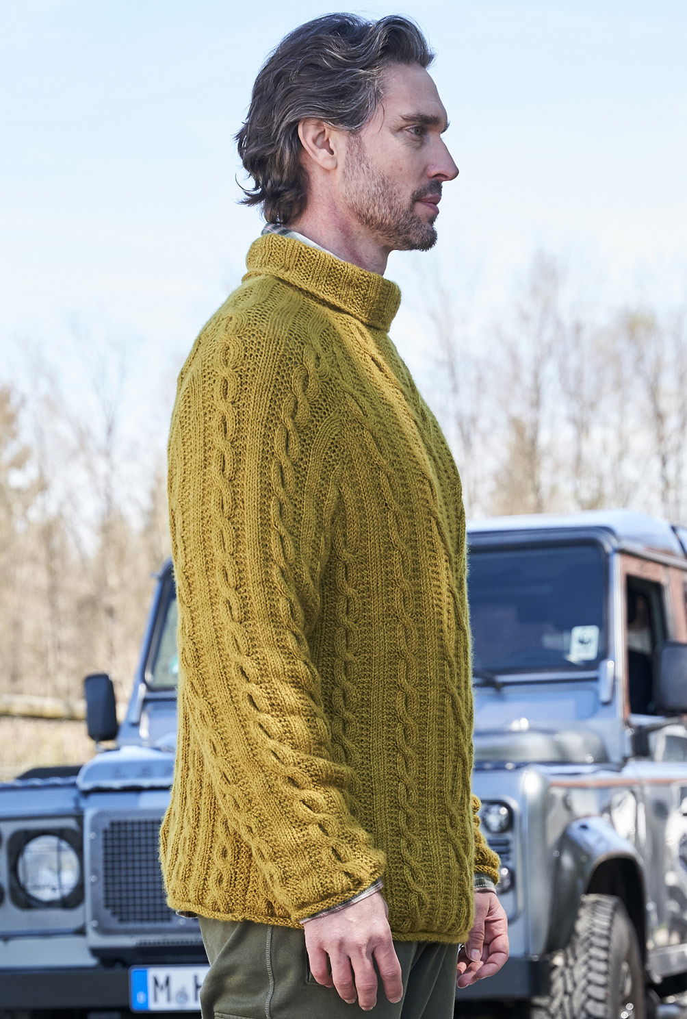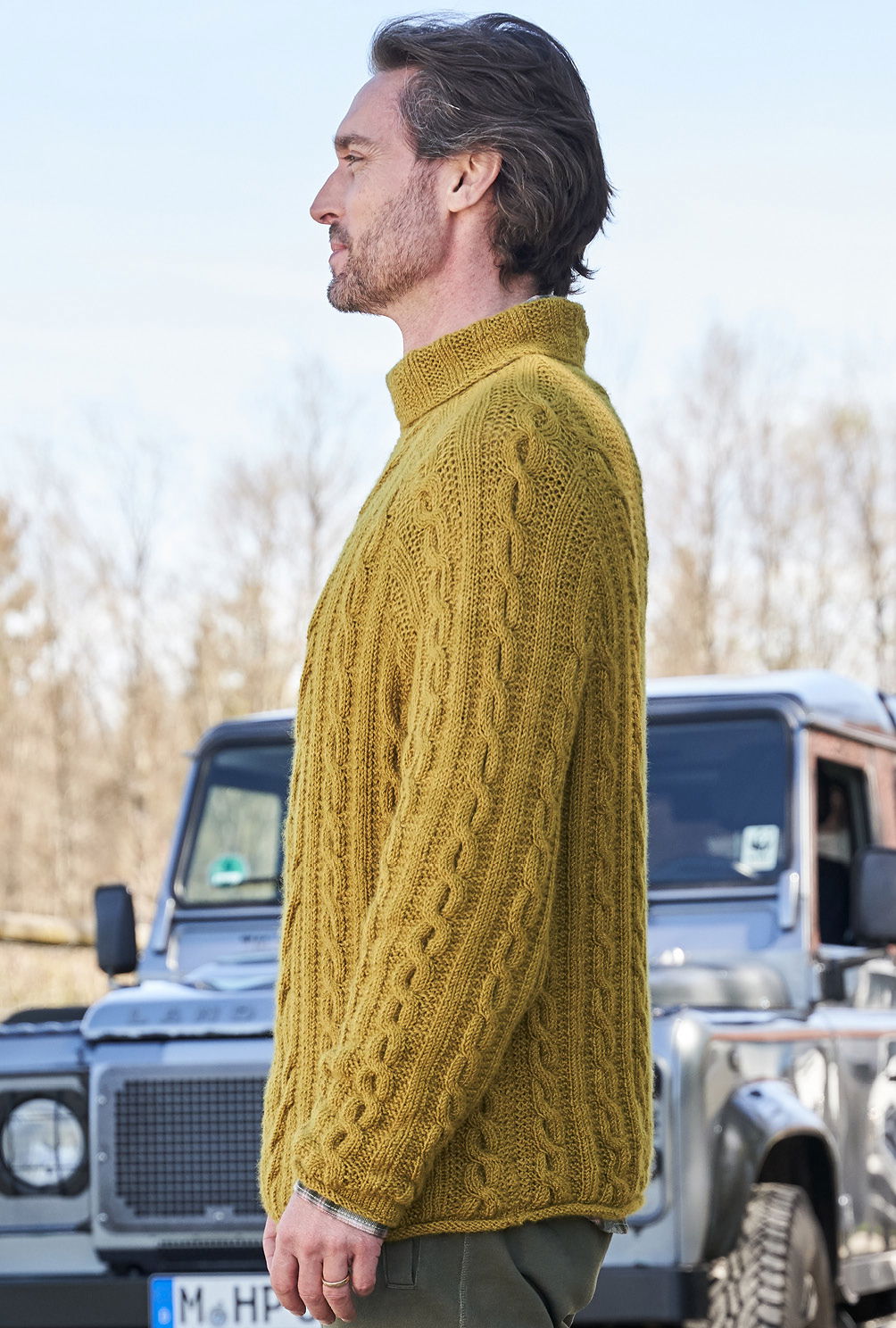 Auf den Spuren von Strukturen: Bei dem currygelben Pulli mit halsfernem Rolli übernehmen markante Zopfmuster die Hauptrolle. Edles Alpakagarn garantiert hohen Tragekomfort. Alpaka Wolle gehört zu den hochwertigsten und damit exklusivsten Arten von Wolle – ein behagliches Wärmegefühl, lange Lebensdauer und unnachahmlicher Strickgenuss sind nur einige Beispiele, die diese Faser so begehrt machen. Gestrickt wird dieser edle Pulli in Einzelteilen und von oben nach unten. Das Rippenzopfmuster bildet einen schönen Rahmen für den markanten Mittelzopf. Beide Muster benötigen ein wenig Aufmerksamkeit, sind aber nicht sonderlich komplex. Die übersichtliche Strickschrift hilft zusätzlich dabei, stets den Überblick zu behalten. Sind alle vier Teile fertig gestrickt, werden noch alle Nähte geschlossen, der Halsausschnitt mit einer Runde fester Maschen umhäkelt, aus denen dann die Maschen für die Halsausschnittblende im Rippenmuster herausgestrickt werden.