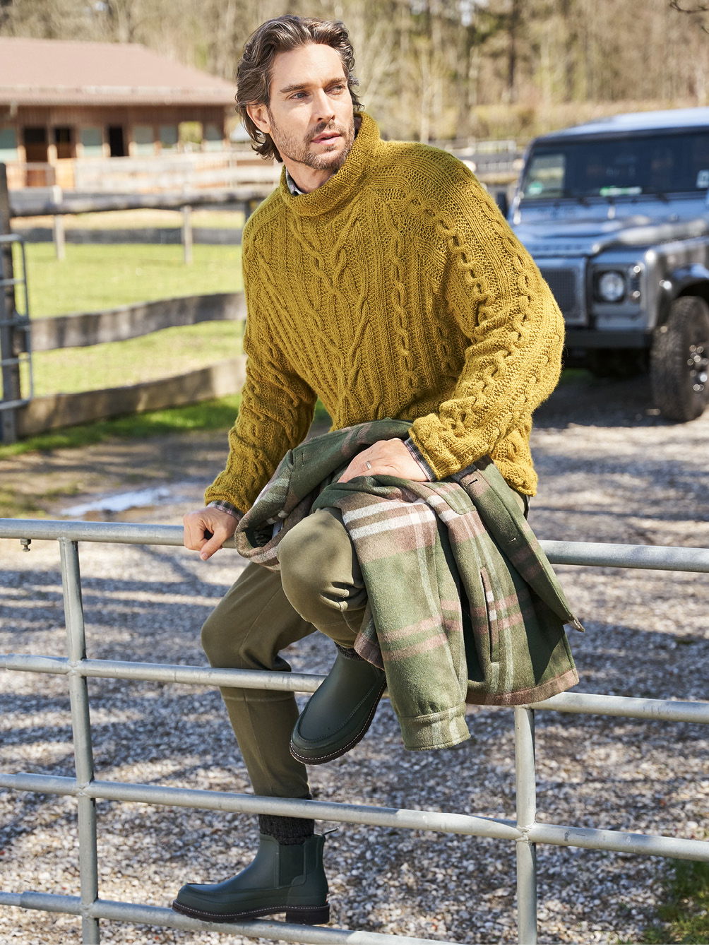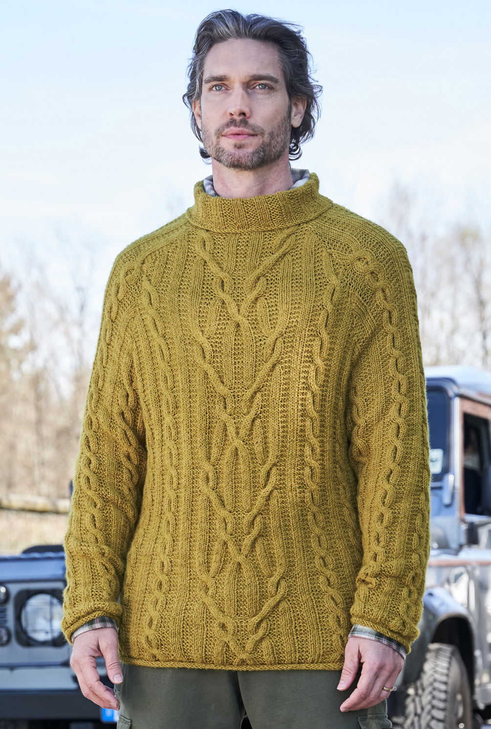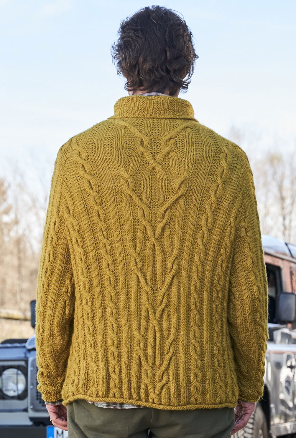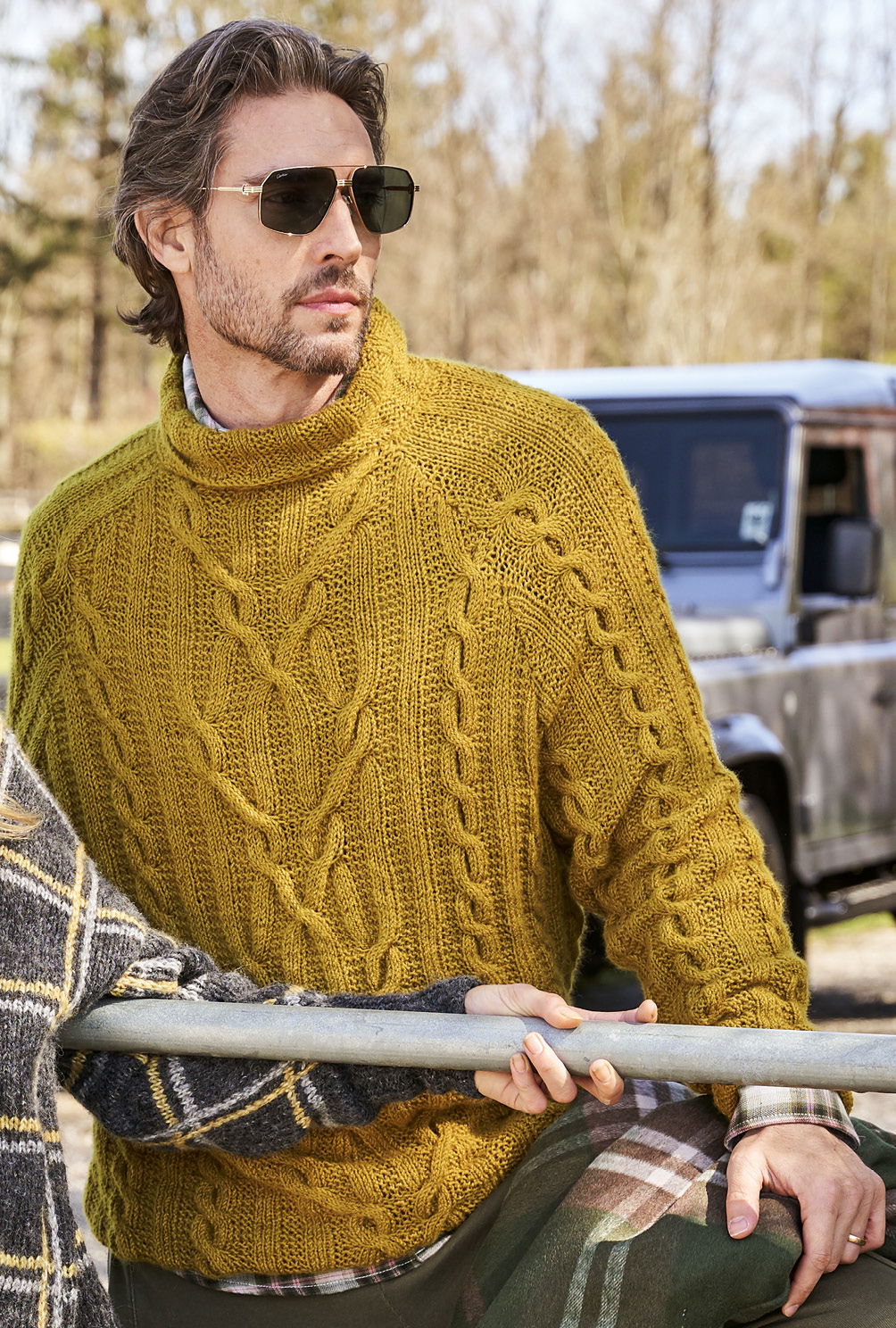 Auf den Spuren von Strukturen: Bei dem currygelben Pulli mit halsfernem Rolli übernehmen markante Zopfmuster die Hauptrolle. Edles Alpakagarn garantiert hohen Tragekomfort. Alpaka Wolle gehört zu den hochwertigsten und damit exklusivsten Arten von Wolle – ein behagliches Wärmegefühl, lange Lebensdauer und unnachahmlicher Strickgenuss sind nur einige Beispiele, die diese Faser so begehrt machen. Gestrickt wird dieser edle Pulli in Einzelteilen und von oben nach unten. Das Rippenzopfmuster bildet einen schönen Rahmen für den markanten Mittelzopf. Beide Muster benötigen ein wenig Aufmerksamkeit, sind aber nicht sonderlich komplex. Die übersichtliche Strickschrift hilft zusätzlich dabei, stets den Überblick zu behalten. Sind alle vier Teile fertig gestrickt, werden noch alle Nähte geschlossen, der Halsausschnitt mit einer Runde fester Maschen umhäkelt, aus denen dann die Maschen für die Halsausschnittblende im Rippenmuster herausgestrickt werden.