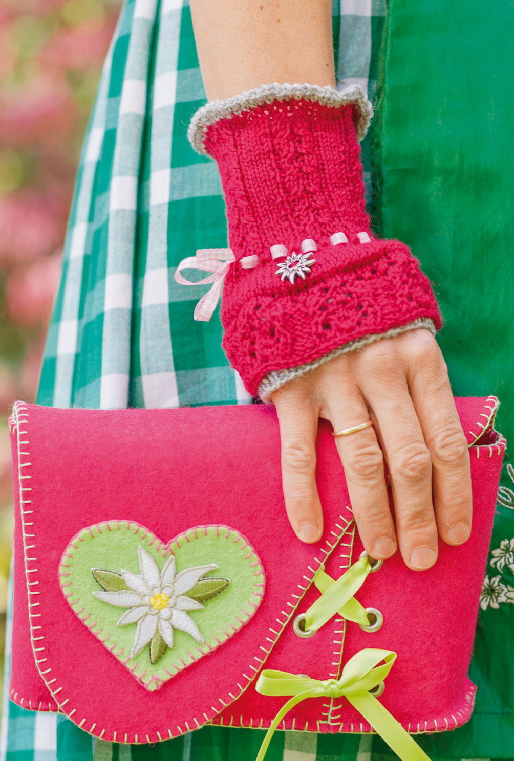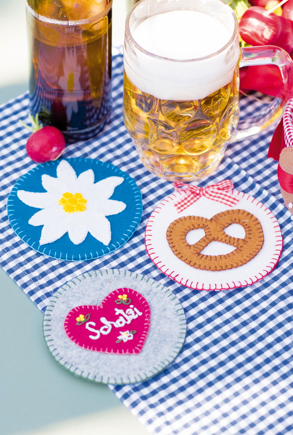 Tassenmanschetten: 25,5 x 7,5 cm; Brotkorb: 22 x 15,5 x 6 cm; Untersetzer: 10,5 cm Ø; Clutch: 20 x 12 x 4 cm; Trachtenstrümpfe: 40/41, 42/43