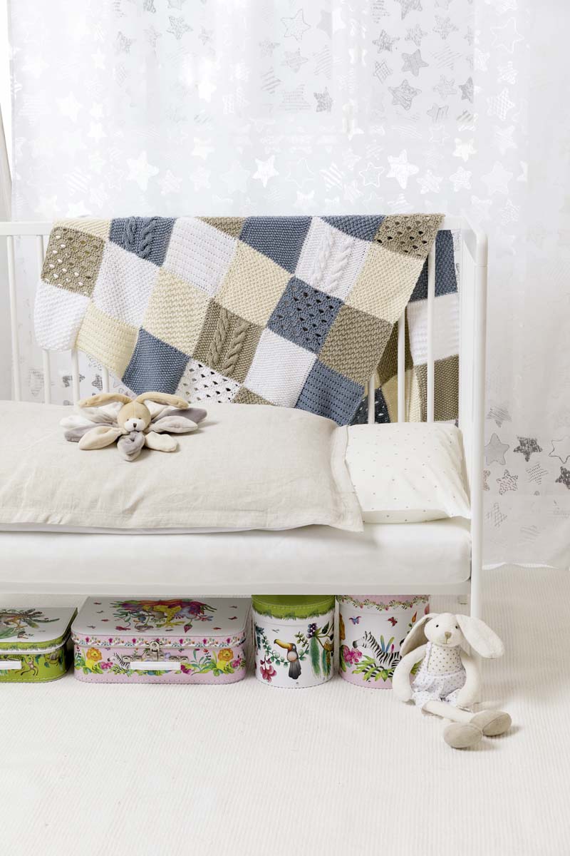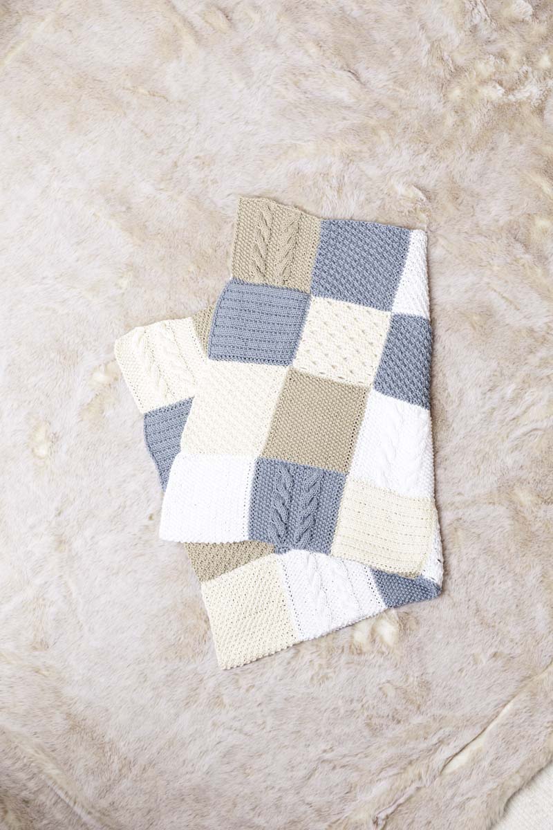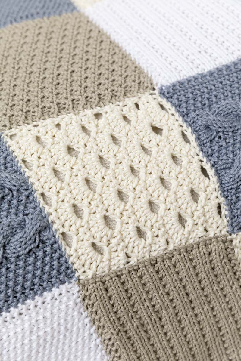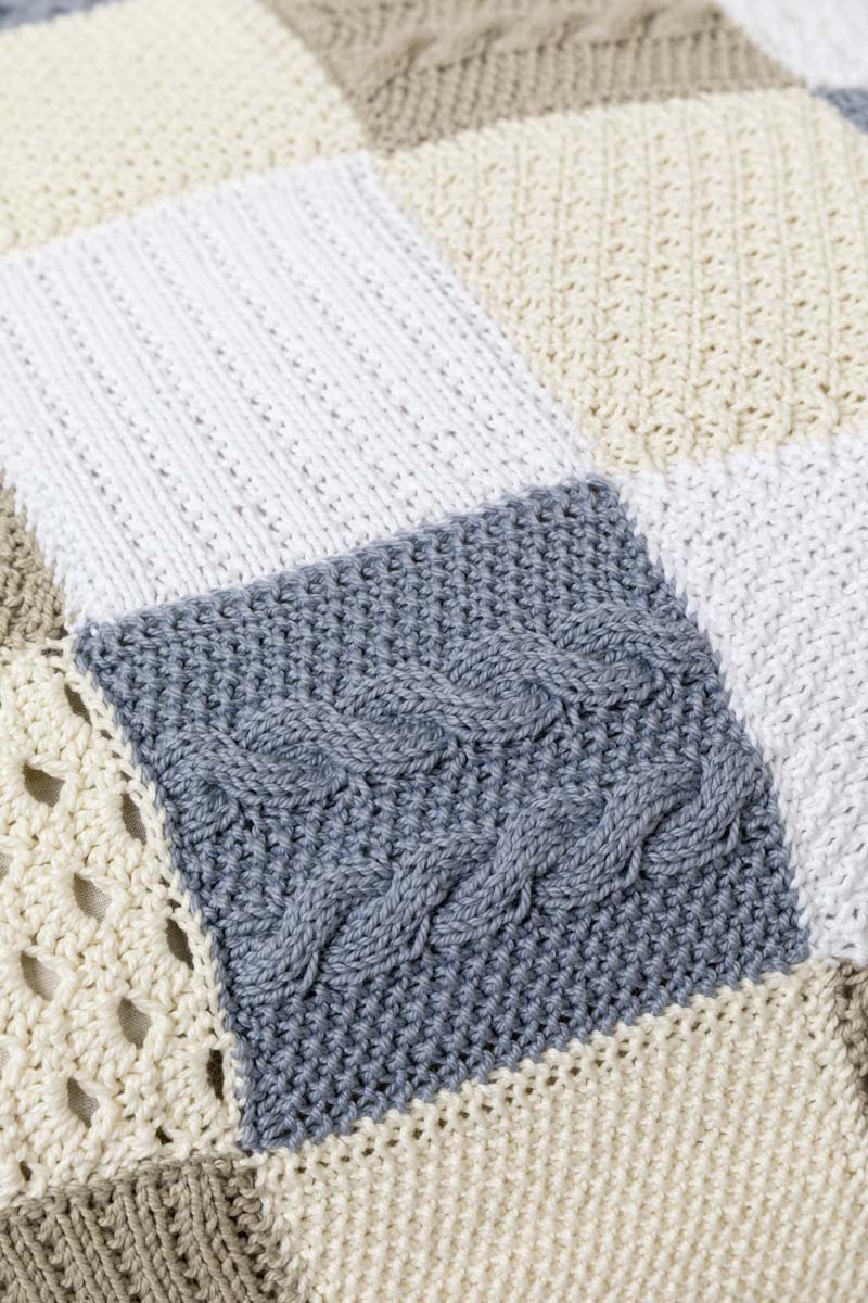 Bei dieser Decke werden 5 verschiedene Muster gestrickt und 1 weiteres Muster gehäkelt.
