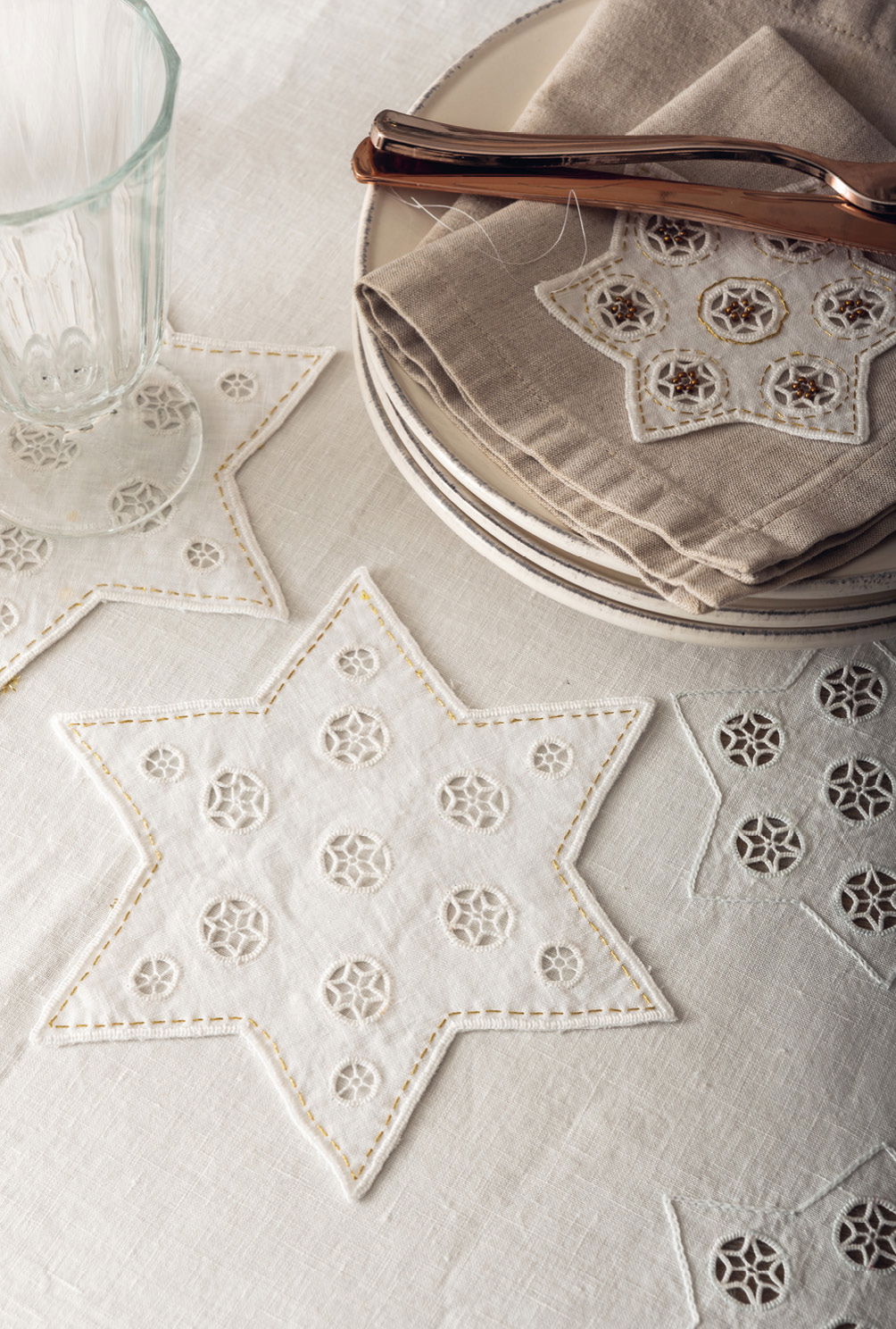 Tischdecke: 135 x 135 cm (Gesamtmotivgröße: 48 cm Ø); Untersetzer: ca 18 cm Ø; großer Anhänger: ca 10,5 cm Ø; kleiner Anhänger: ca 6,5 cm Ø; Stulpen: ca 26 cm lang