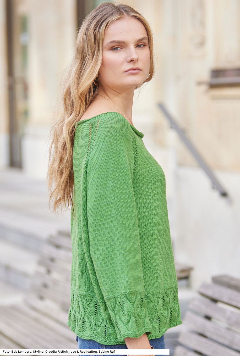 Wer beim Stricken rasch vorankommen will und nicht gerne zusammennäht, wird an diesem Pullover mit 3/4-Ärmeln seine Freude haben. Er wird von oben nach unten (RVO) nahtlos in einem Stück gearbeitet. Die durch Löcher betonten Raglanschrägen sind neben der Ajourmuster-Bordüre am Saum von Vorder-, Rückenteil und Ärmeln ein weiteres Stilelement. Ansonsten wird glatt rechts gestrickt und auch nach dem Anschlag so begonnen, dadurch erhält der Halsausschnitt einen kleinen Rollrand. Ein Pulli aus einem Garn mit halb Schurwolle, halb Baumwolle. Die Anleitung gibt es für die Größen 36/38, 42/44 und 48/50.