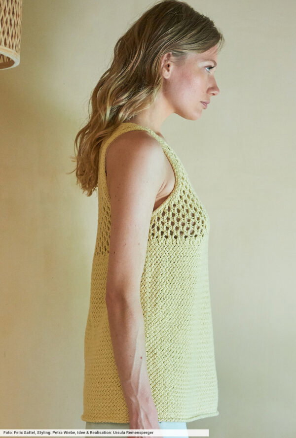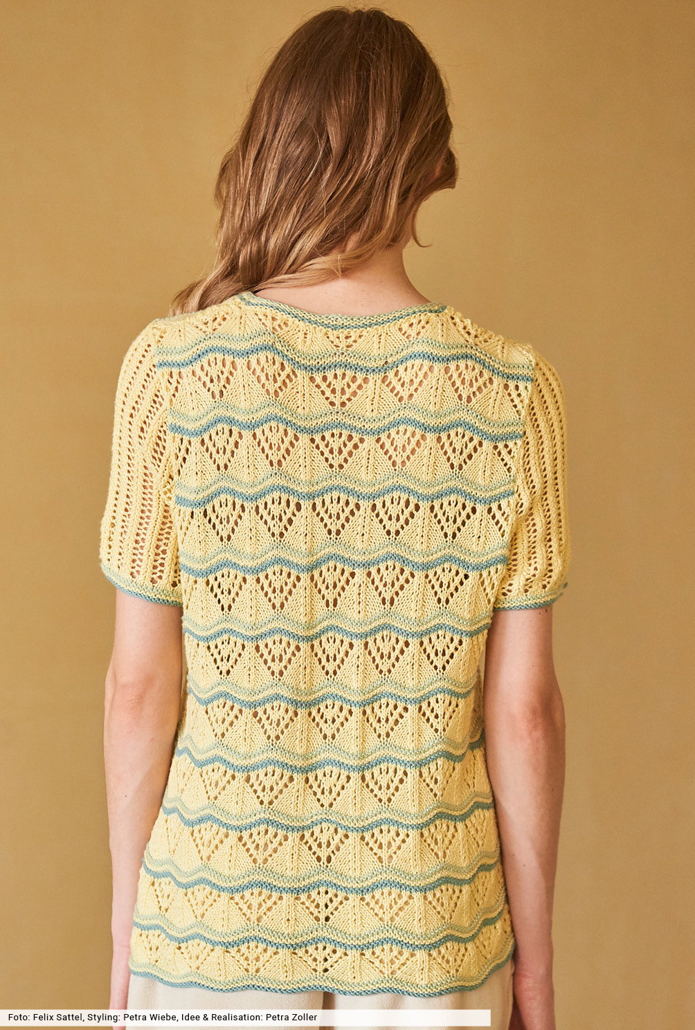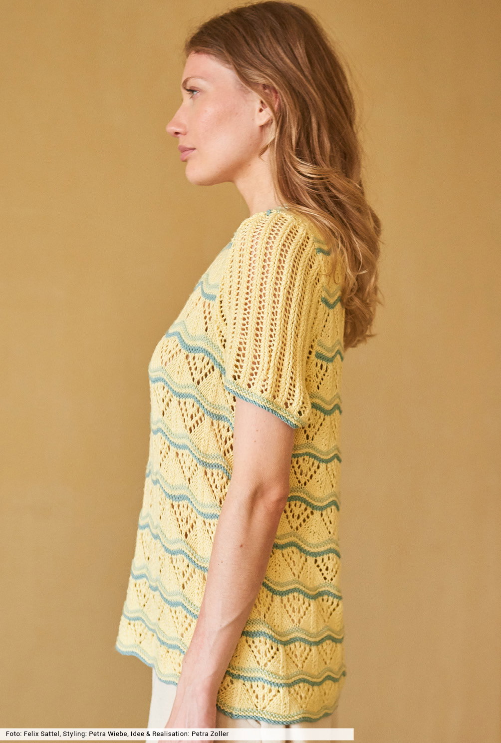Material: FERNER"Baby Soft" (50% Baumwolle, 50% Soja, LL = 135 m/50 g) 250 (300) 350 g Vanille (Fb BAS206), je 50 (50) 100 g Hellblau (Fb BAS147) undMint (Fb BAS500). 1 Paar Stricknadel Nr 3 und 1 Rundstricknadel Nr 3.