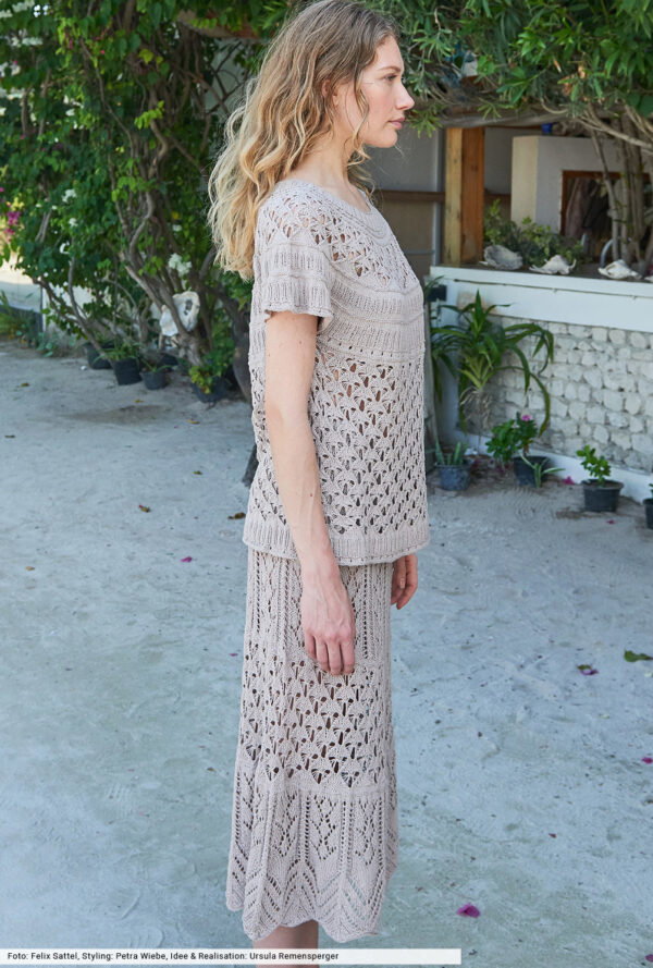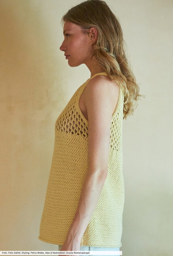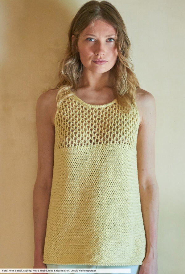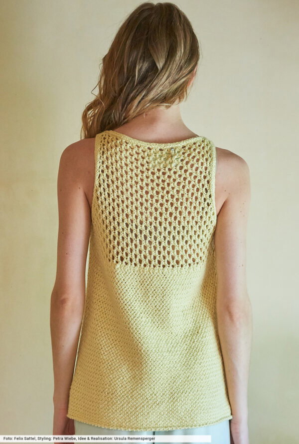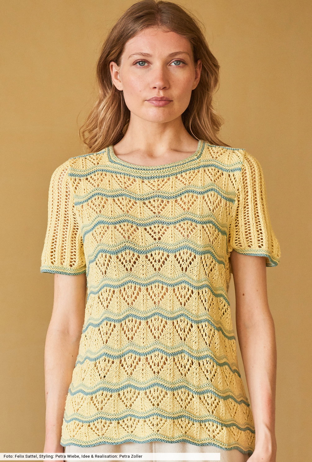 Material: FERNER"Baby Soft" (50% Baumwolle, 50% Soja, LL = 135 m/50 g) 250 (300) 350 g Vanille (Fb BAS206), je 50 (50) 100 g Hellblau (Fb BAS147) undMint (Fb BAS500). 1 Paar Stricknadel Nr 3 und 1 Rundstricknadel Nr 3.