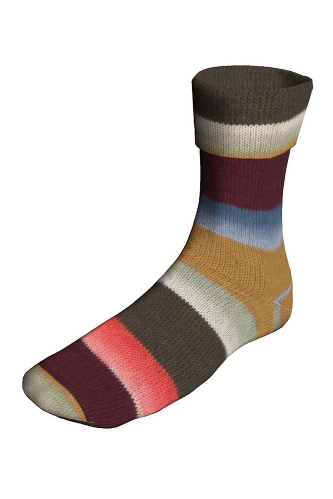 Die Zwillingssocken mit zwei identischen Farbverläufen auf einem Knäuel. Beginnen Sie die erste Socke mit dem Faden aus dem Innern. Nach ca. 200 m finden Sie ein Stück unbedrucktes Garn. Schneiden Sie dieses weg. Daran anschliessend beginnt der gleiche Farbverlauf für die zweite Socke.