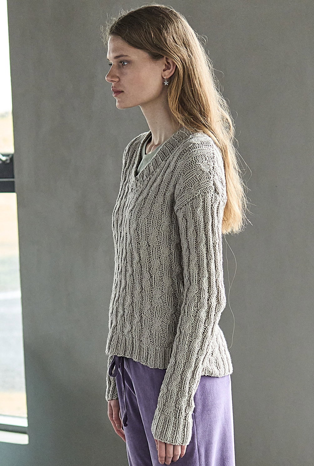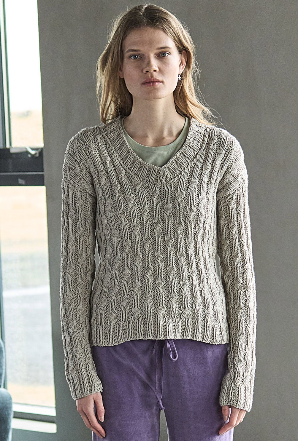 Die gleichmäßigen Zopfstrukturen ziehen sich allover über alle vier Teile dieses beigegrauen Pullovers. Elastische Rippenblenden am Saum und V-Ausschnitt halten alles schön in Form und vermitteln den klassischen Charakter – ein anpassungsfähiges Lieblingsstück, das Dich länger als eine Saison begleitet. Dafür sorgt auch das griffige Ganzjahres-Garn: Bio-Schurwolle, Bio-Baumwolle und recyceltes Kaschmir ist einer toller Mix, der für Nachhaltigkeit und Umweltbewusstein steht.
