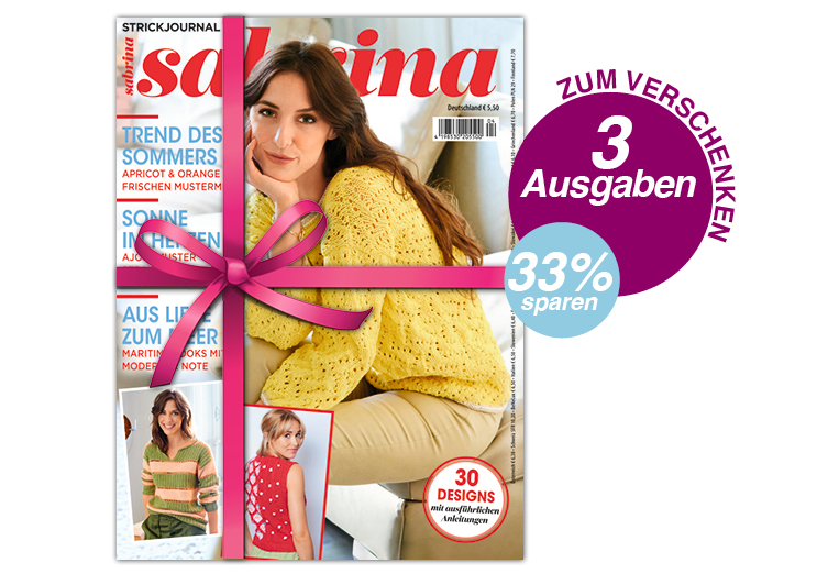 Ja, ich verschenke Sabrina Strickjournal für 3 Monate zum Vorteilspreis von 11,00 €! Ich brauche nichts tun. Die Lieferung endet nach dem Bezugszeitraum von 3 Monaten automatisch.
