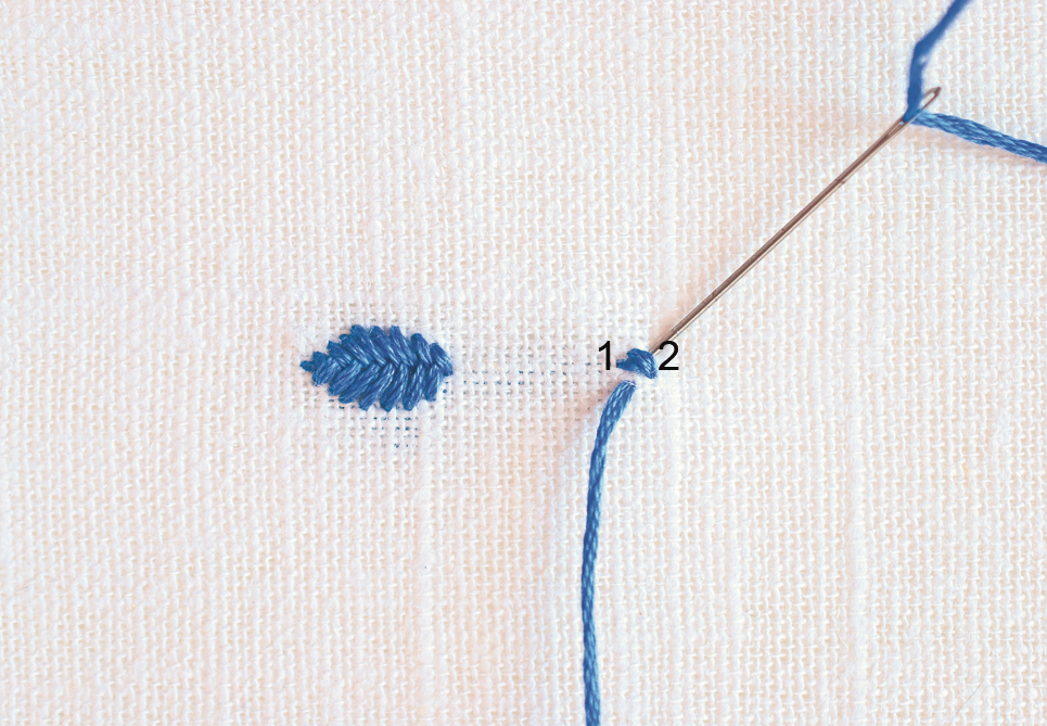 Mit einem kurzen Vorstich Blattspitze und Mittellinie markieren. Schräg vom rechten Blattrand (Punkt 1) bis knapp über die Mittellinie stechen (Punkt 2). Knapp auf der rechten Seite der Mittellinie bei Punkt 3 ausstechen und bei entgegengesetzter Schrägstellung bei Punkt 4 am linken Blattrand einstechen; den rechten Schrägstich dabei überkreuzen. Stets von einer Seite zur anderen arbeiten.