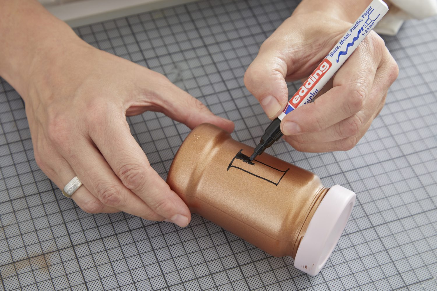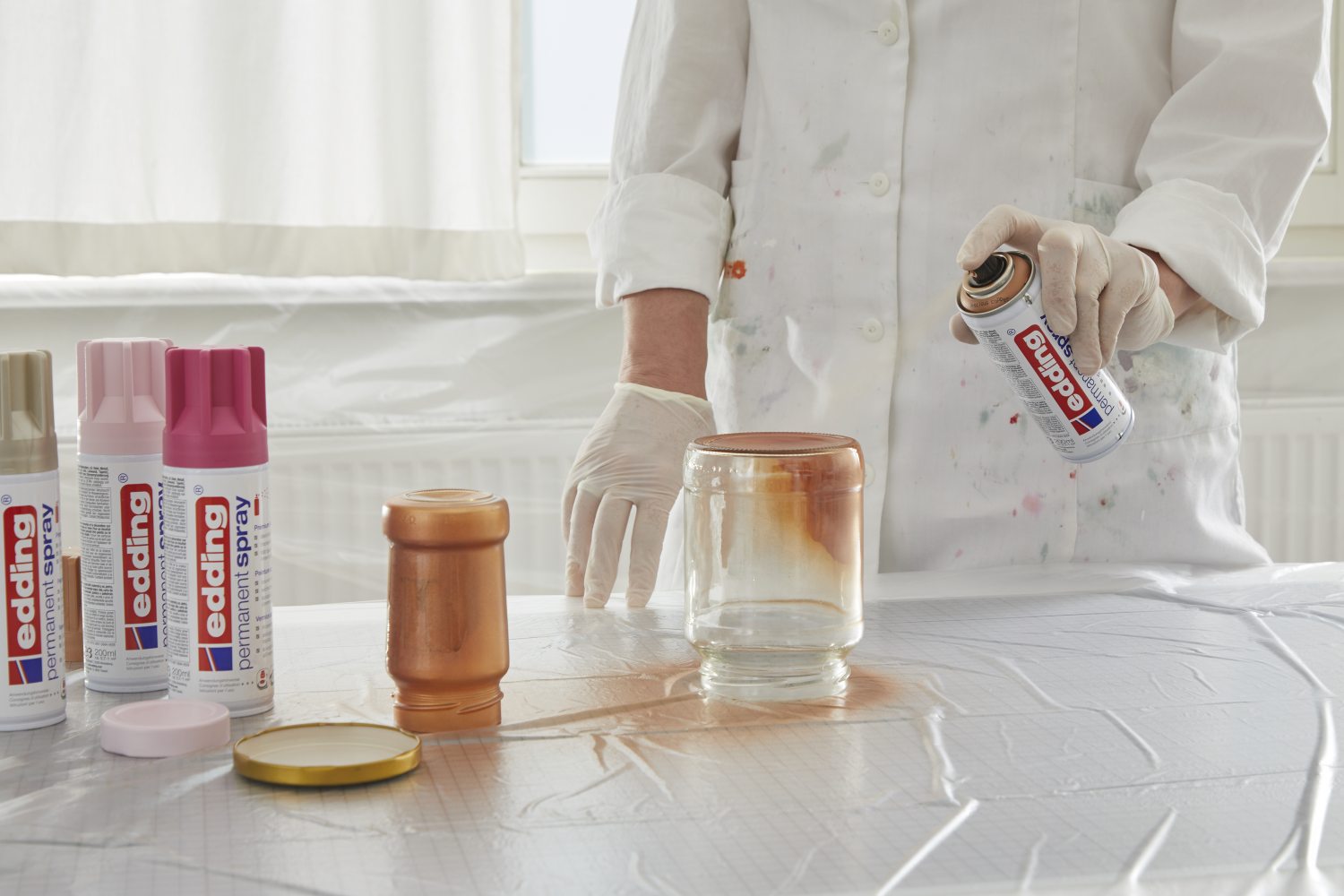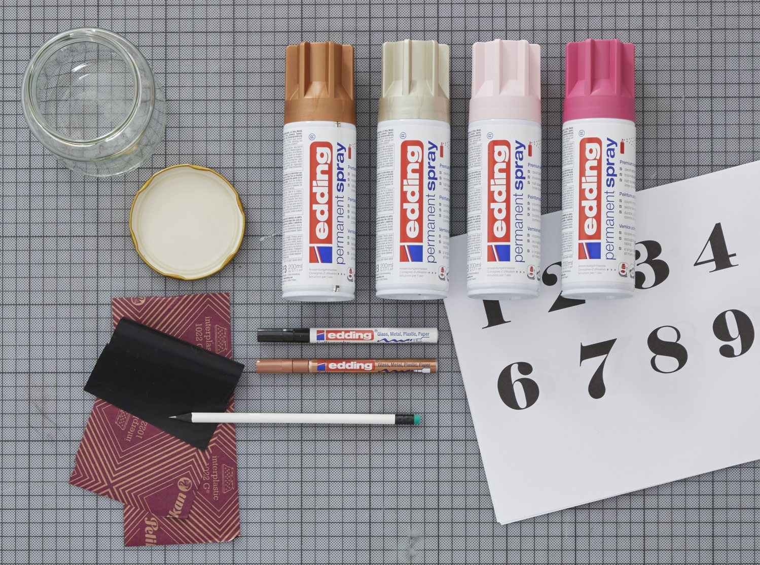 Adventskalender sind perfekt, um sich die Wartezeit auf das Fest zu verkürzen, und dieser hier ist eine verblüffend einfache Variante. Leere Gläser mit Schraubdeckel werden in aufeinander abgestimmten dekorativen Farben mit dem Permanentspray von edding gestaltet. Mit Farbe besprüht, ist der Inhalt nicht mehr zu erkennen, die Überraschung ist also garantiert!