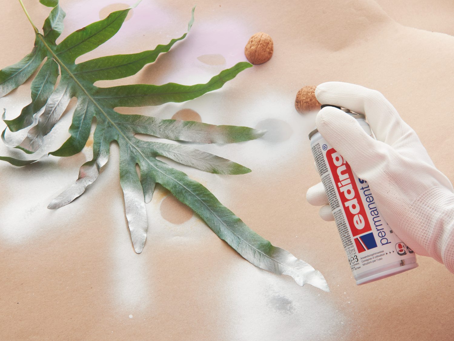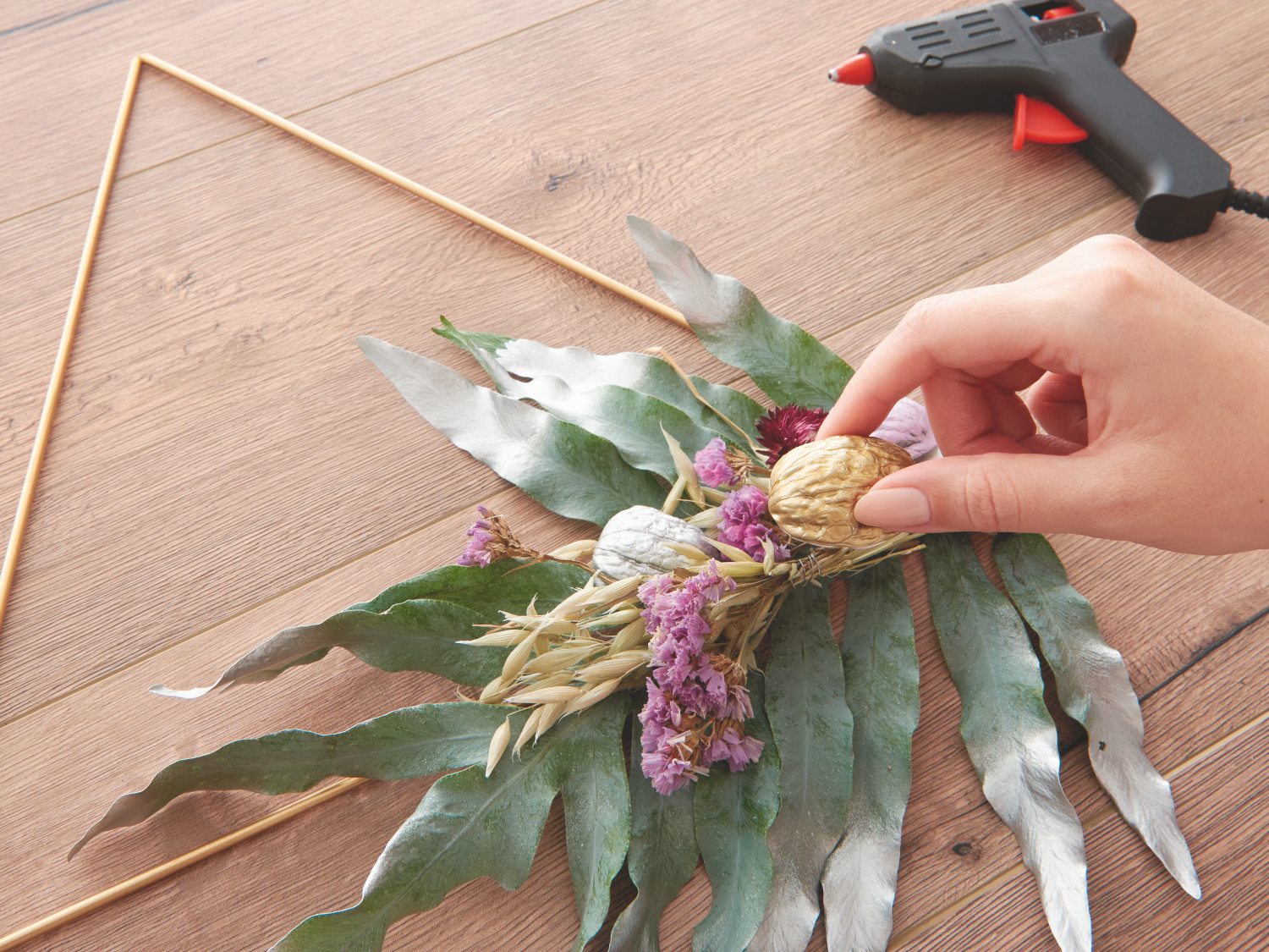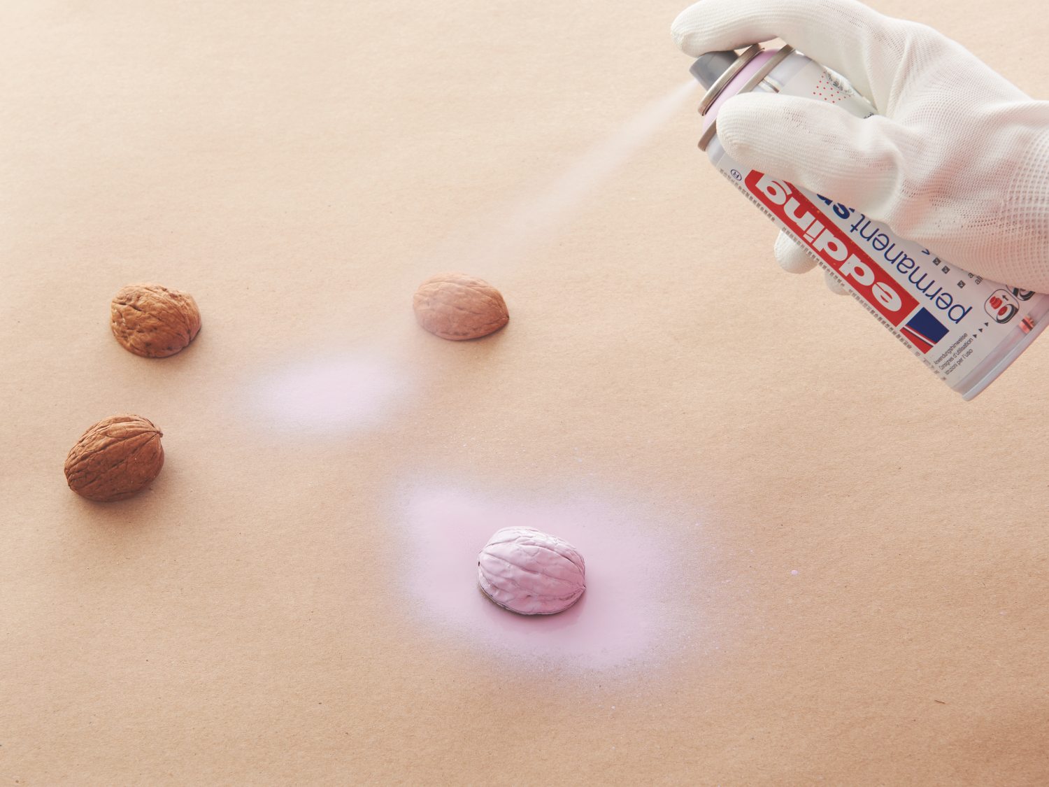 Diese adventliche Wanddekoration kombiniert auf harmonische Weise ein getrocknetes Palmenblatt, zarte Trockenblumen und dekorative Walnüsse zu einem einzigartigen Arrangement. Durch den Einsatz von Acryllackspray lassen sich zudem besondere Akzente setzen – schimmernde Farbspiele, die das natürliche Material veredeln und ihm einen festlichen Charakter verleihen. Besonders für Naturmaterialien ist das Acryllackspray perfekt geeignet, da das Spray jede kleinste Ecke des Objekts erreicht.