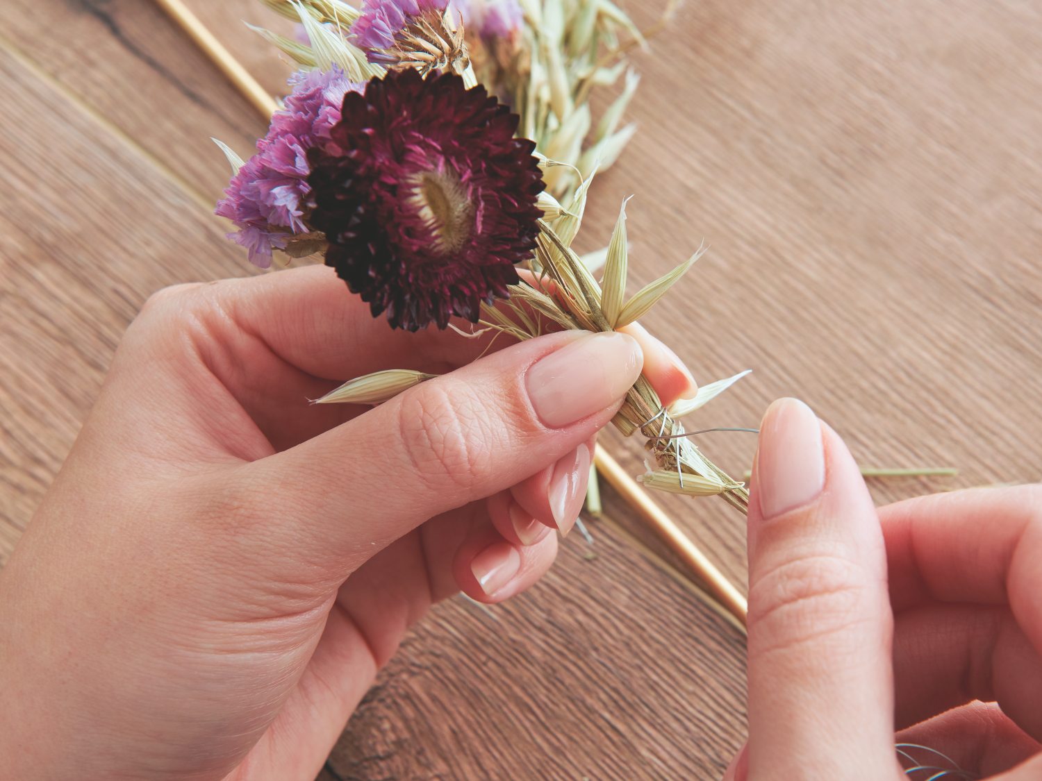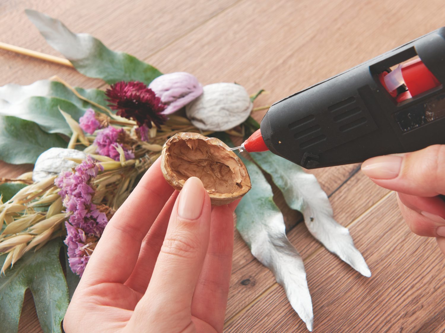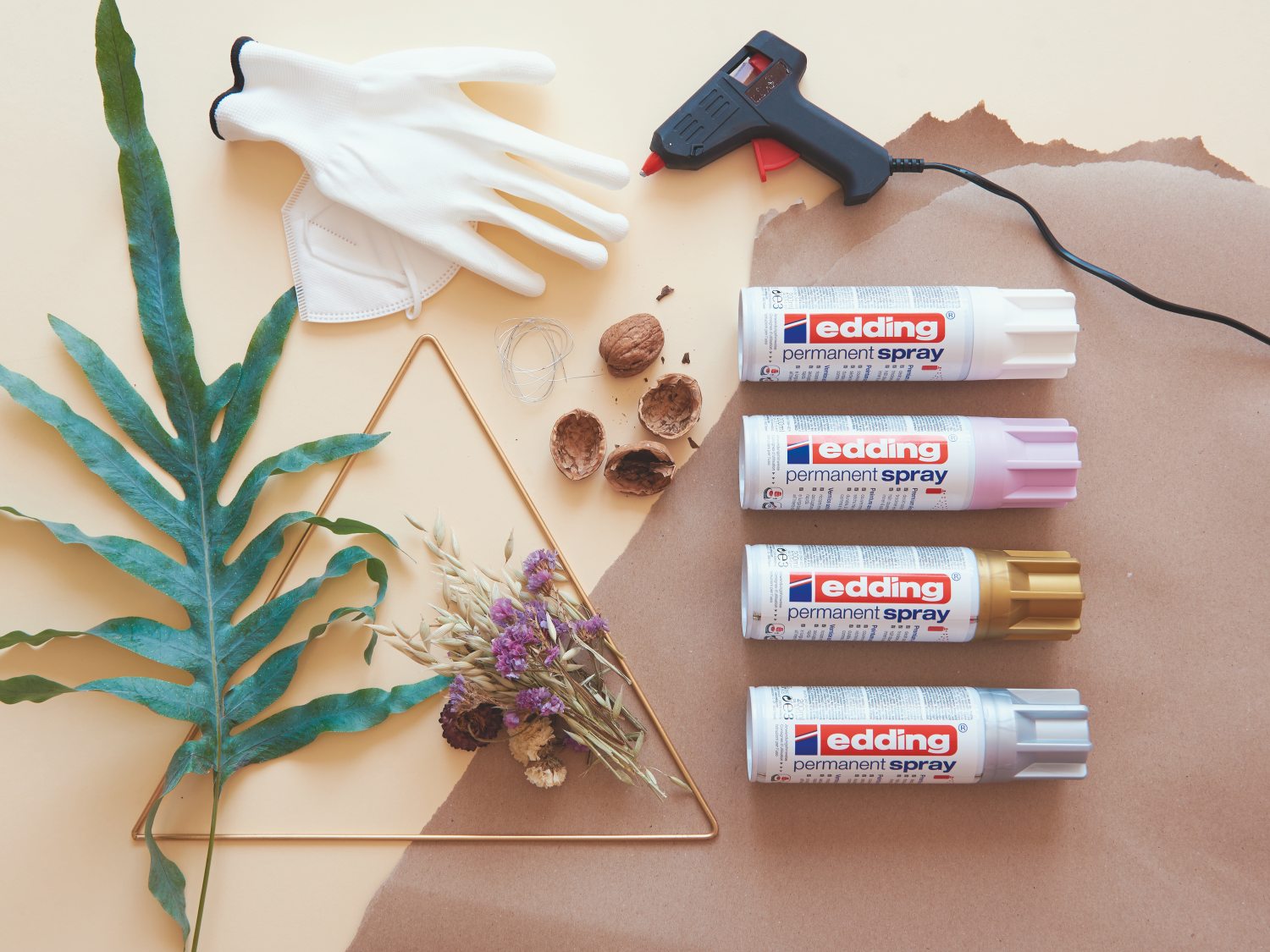 Diese adventliche Wanddekoration kombiniert auf harmonische Weise ein getrocknetes Palmenblatt, zarte Trockenblumen und dekorative Walnüsse zu einem einzigartigen Arrangement. Durch den Einsatz von Acryllackspray lassen sich zudem besondere Akzente setzen – schimmernde Farbspiele, die das natürliche Material veredeln und ihm einen festlichen Charakter verleihen. Besonders für Naturmaterialien ist das Acryllackspray perfekt geeignet, da das Spray jede kleinste Ecke des Objekts erreicht.