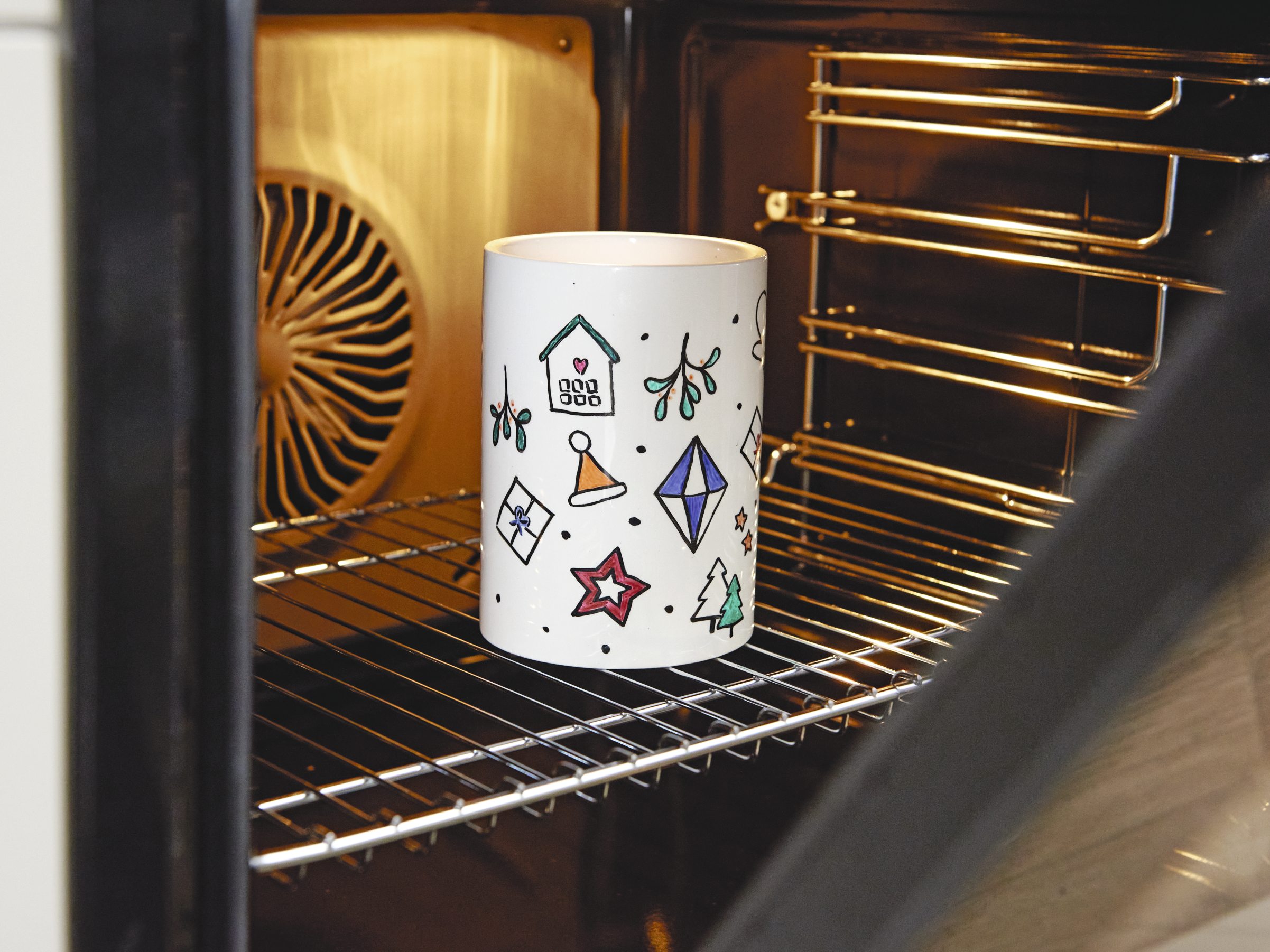 Reinige die Dose vor dem Bemalen gründlich mit Brennspiritus, zeichne anschließend die Konturen mit dem schwarzen Stift und verleihe deinen Motiven mit Farbe und Fantasie den letzten Schliff. Kleine Fehler lassen sich vor dem Einbrennen ganz leicht mit einem feuchten Tuch korrigieren. Nach dem Trocknen sorgt das Einbrennen bei 160 °C im Backofen für eine dauerhafte, spülmaschinenfeste Bemalung.