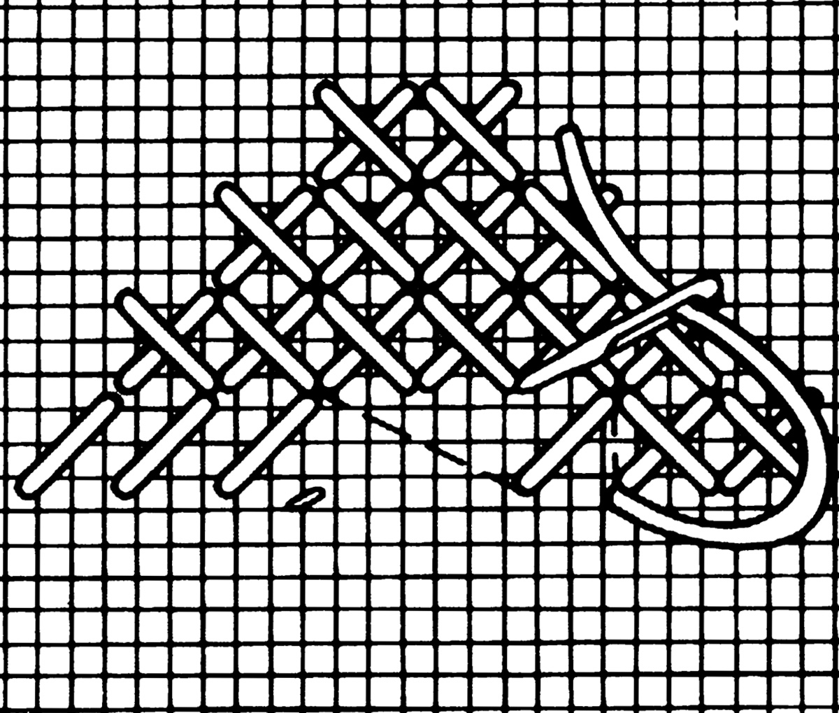 Arbeite dich für diagonale Reihen mit dem ersten Unterstich von links unten zur rechten oberen Ecke vor. Steche deine Nadel dann gerade nach unten zum Ansatz des Deckstichs durch. Um danach den Stich durch einen darüber gelegten Oberstich fertig zu stellen, führst du die Nadel schräg nach unten zum nächsten Unterstich-Austritt.